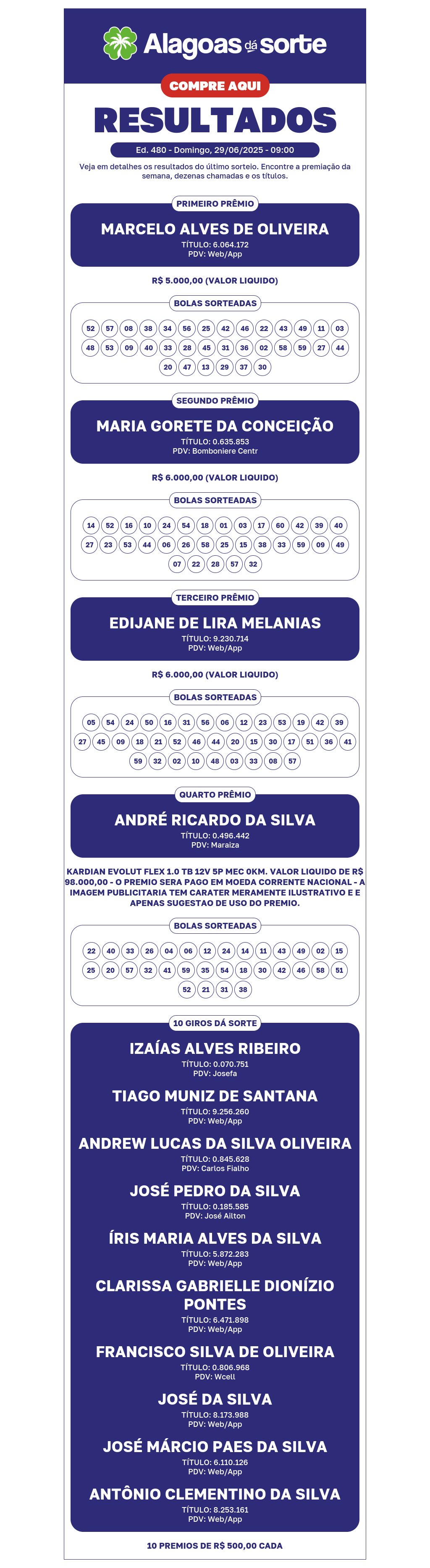 Veja os ganhadores do sorteio do Alagoas dá Sorte deste domingo, 23 de novembro