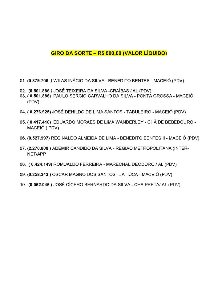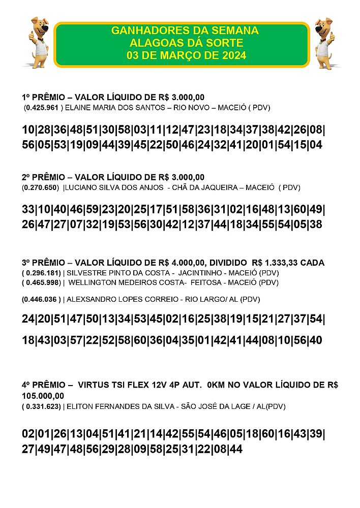 Confira os ganhadores do sorteio do Alagoas dá Sorte da edição deste domingo,3.