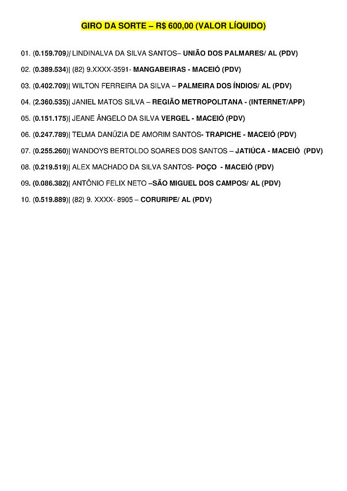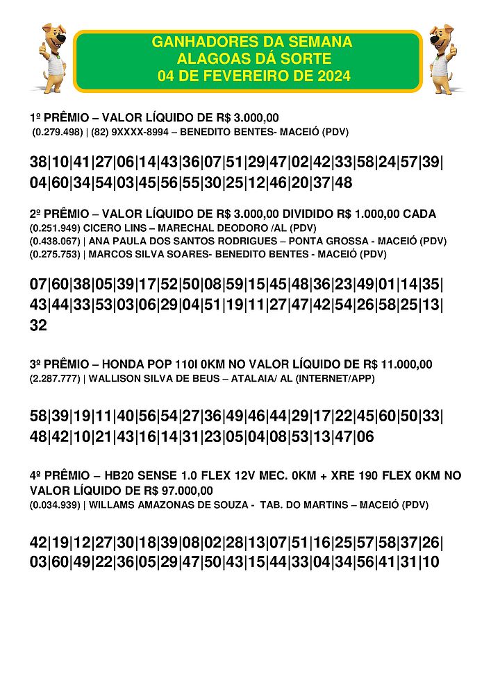 Confira o resultado do sorteio do Alagoas dá Sorte deste domingo, 4 de fevereiro.