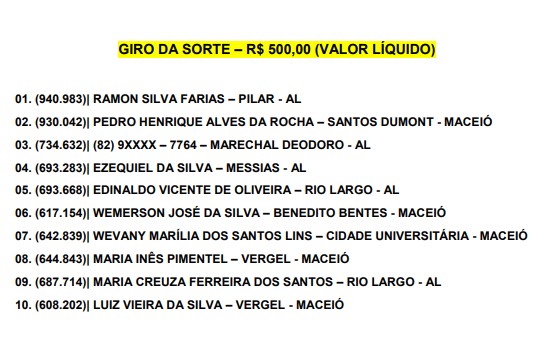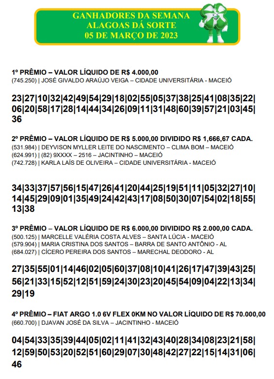 Confira os ganhadores do Alagoas dá Sorte deste domingo, 5.
