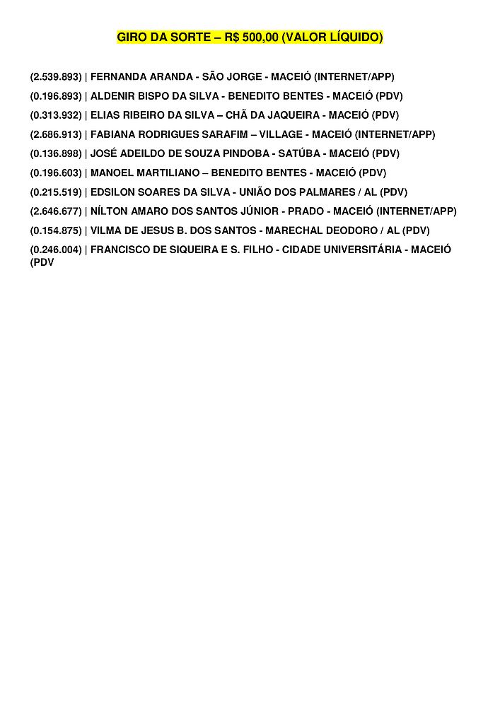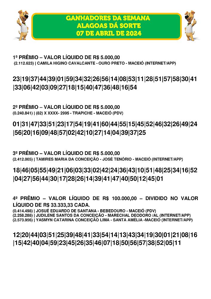 Confira os ganhadores da edição do Alagoas dá Sorte deste domingo, 7 de abril.