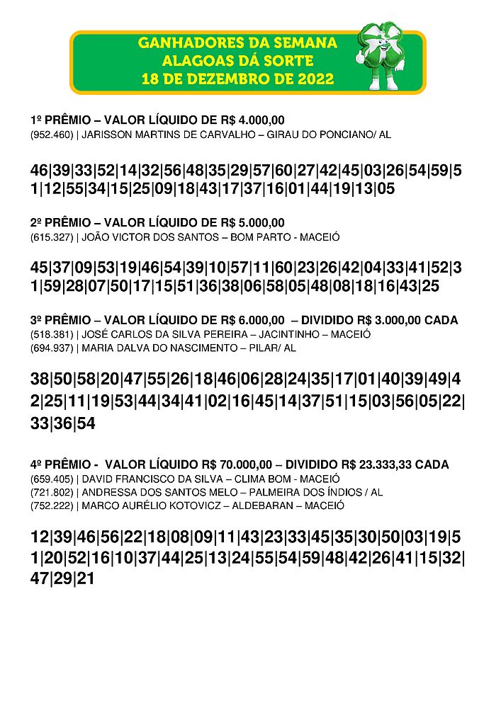 Confira o resultado do sorteio da edição do Alagoas dá Sorte deste domingo, 18.