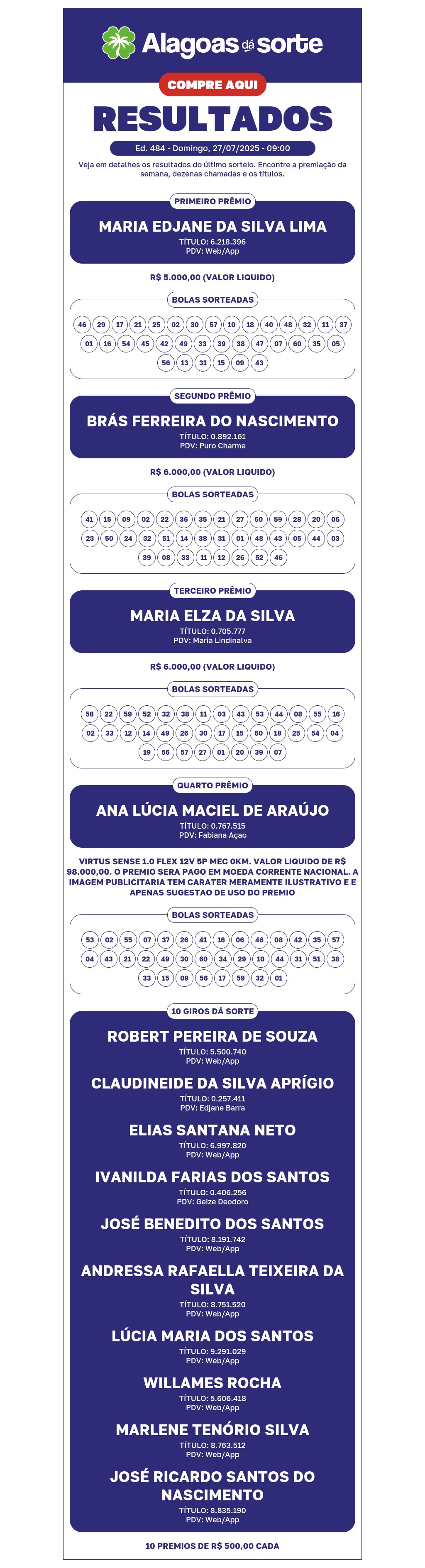 Confira o resultado do sorteio do Alagoas dá Sorte deste domingo 27 de julho: