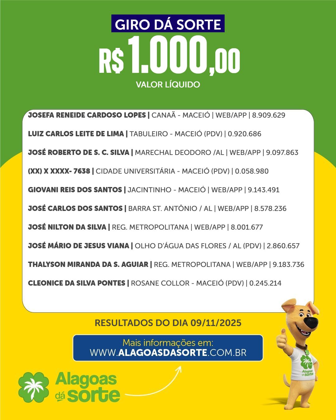 Confira os ganhadores do sorteio do Alagoas dá Sorte deste domingo, 9 de novembro.