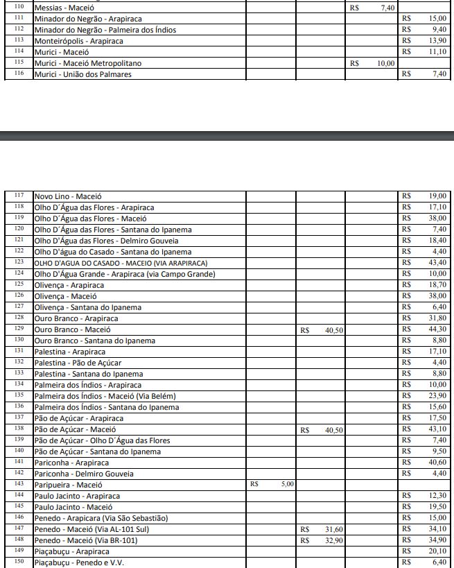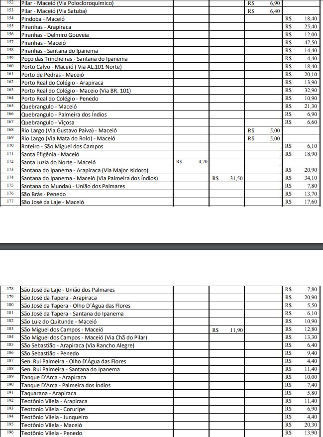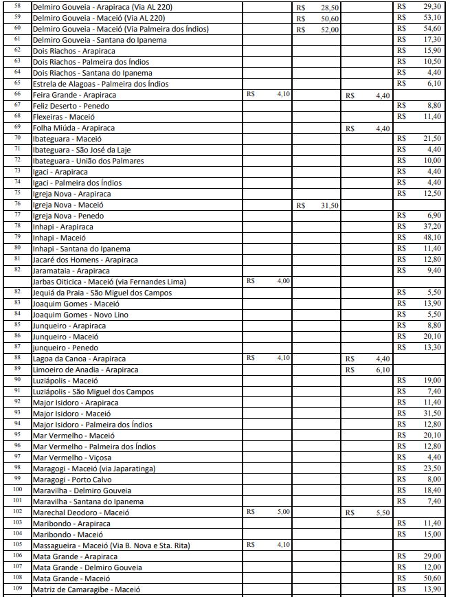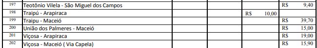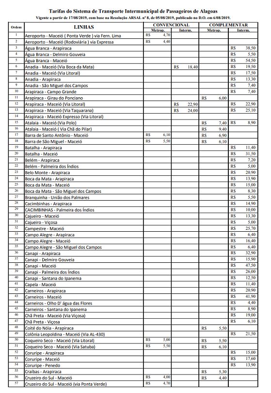Após reajuste de 7,27% nos valores da tarifa das passagens dos transportes intermunicipais, a Agência Reguladora de Serviços Públicos do Estado de Alagoas (Arsal) divulgou nesta sexta-feira (16) a nova tabela com os preços reajustados. A nova tarifa para as categorias convencionais (ônibus) e complementares (vans e micro-ônibus) começa a ser cobrada a partir deste sábado, 17.