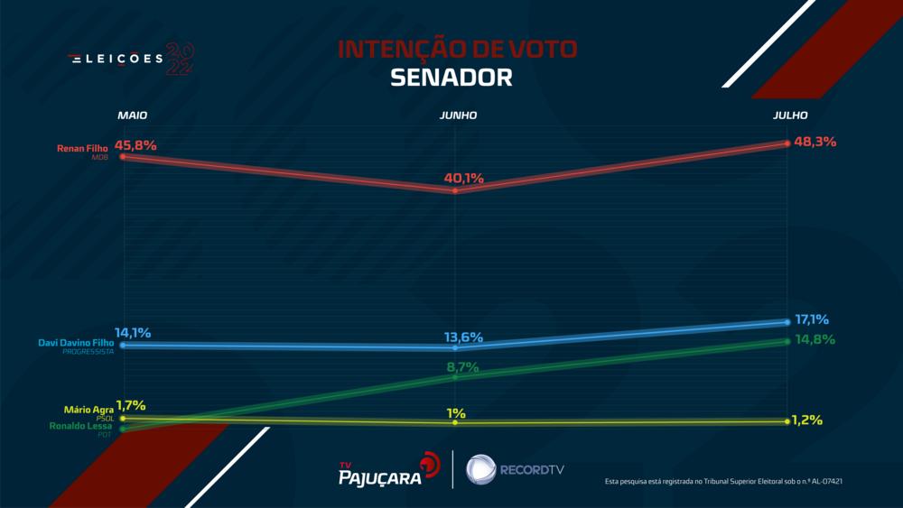 Para senador, Renan Filho (MDB) continua liderando com folga, agora com 48,3% das intenções de voto; seguido por Davi Davino Filho, do Progressista, 17,1%. Ronaldo Lessa (PDT) aparece em terceiro, com 14,8%. Brancos e nulos, e não votariam em nenhum dos candidatos apresentados, 13,2%, Não sabe, não respondeu, 5,4%. Veja os números: