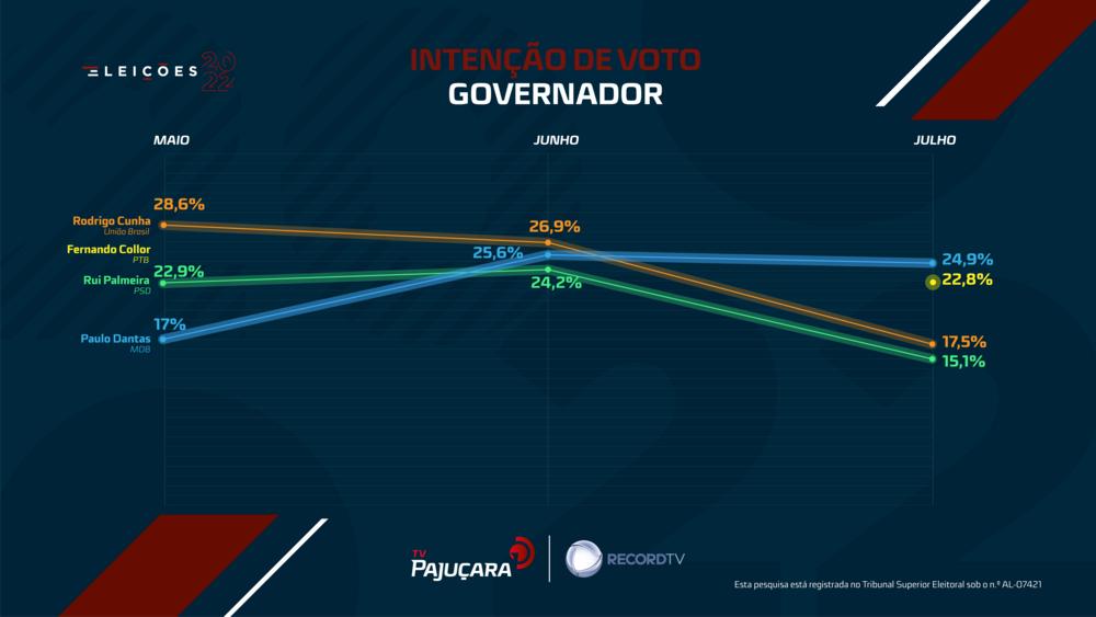 Na disputa para governo do estado o cenário sofreu mudanças em comparação com a última pesquisa. Rodrigo Cunha, do União Brasil, que liderava as intenções de voto nas duas primeiras pesquisas, caiu para a terceira colocação (17,5%), perdendo a liderança para Paulo Dantas, do MDB (24.9%). Pesou também o surgimento da candidatura do senador Fernando Collor (PTB), que aparece em segundo lugar, com 22,8% das intenções de voto. Rui Palmeira tem 15,1% das intenções de votos. 11% dos entrevistados não votariam em nenhum dos nomes apresentados, ou em branco ou nulo. Não sabe, não respondeu, 8,6%. Confira a evolução dos números.