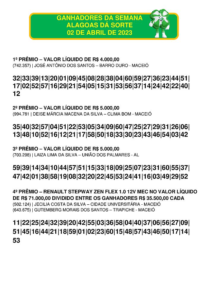 Confira, abaixo, os resultados do Alagoas Dá Sorte deste domingo, 02 de abril de 2023: