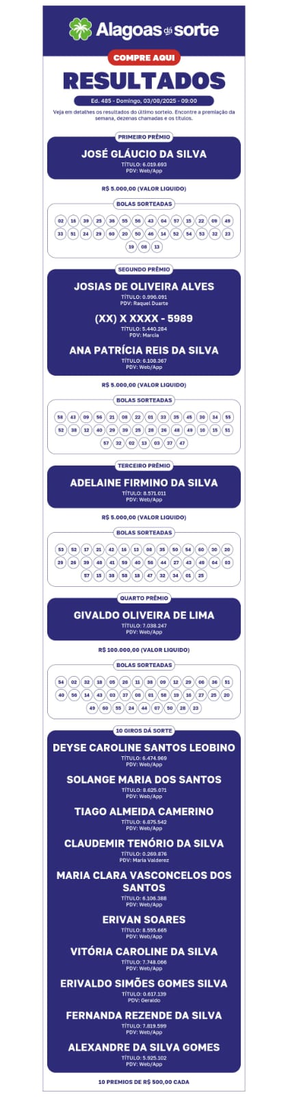Confira os resultados do Alagoas dá Sorte deste domingo, dia 03 de agosto de 2025.