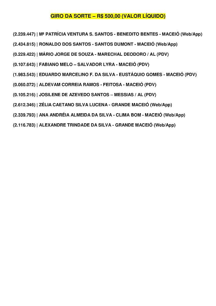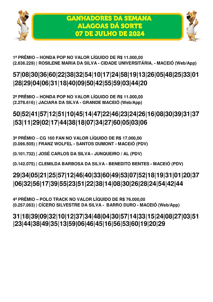 Confira os ganhadores do Alagoas dá Sorte deste domingo, dia 07 de julho de 2024.