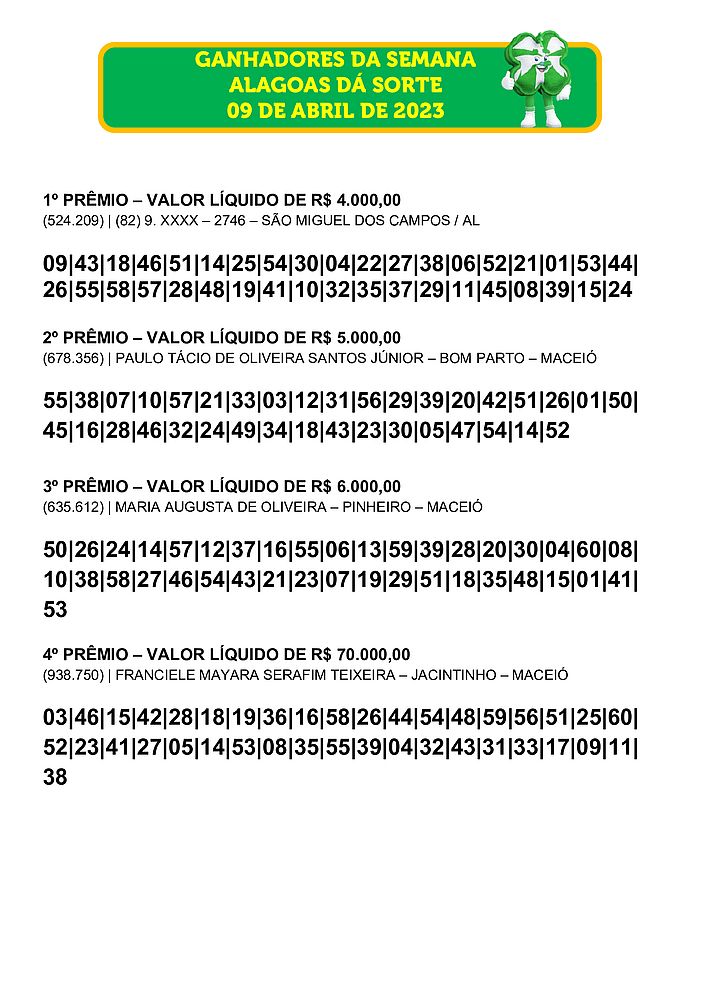 Confira os resultados do Alagoas dá Sorte deste domingo de Páscoa, dia 09 de abril de 2023.