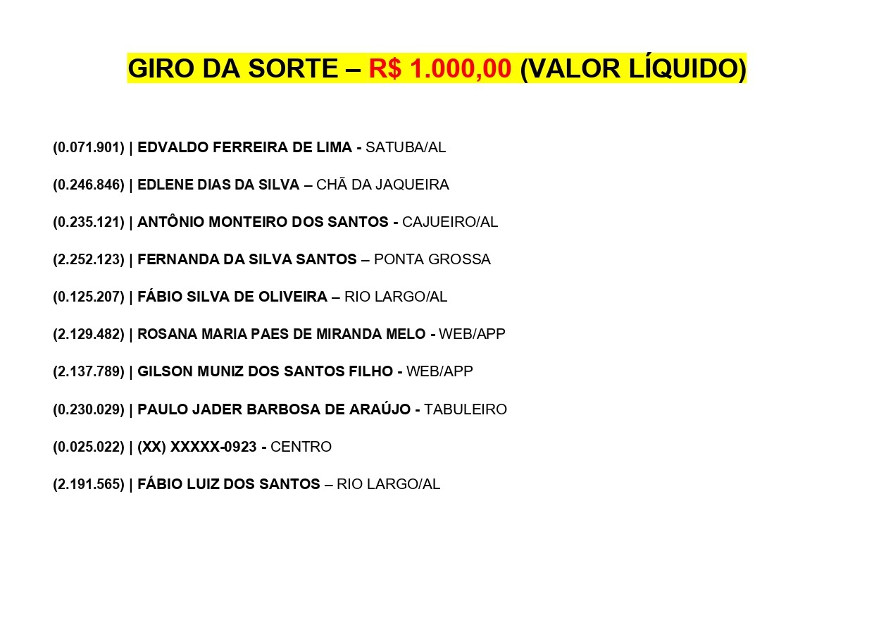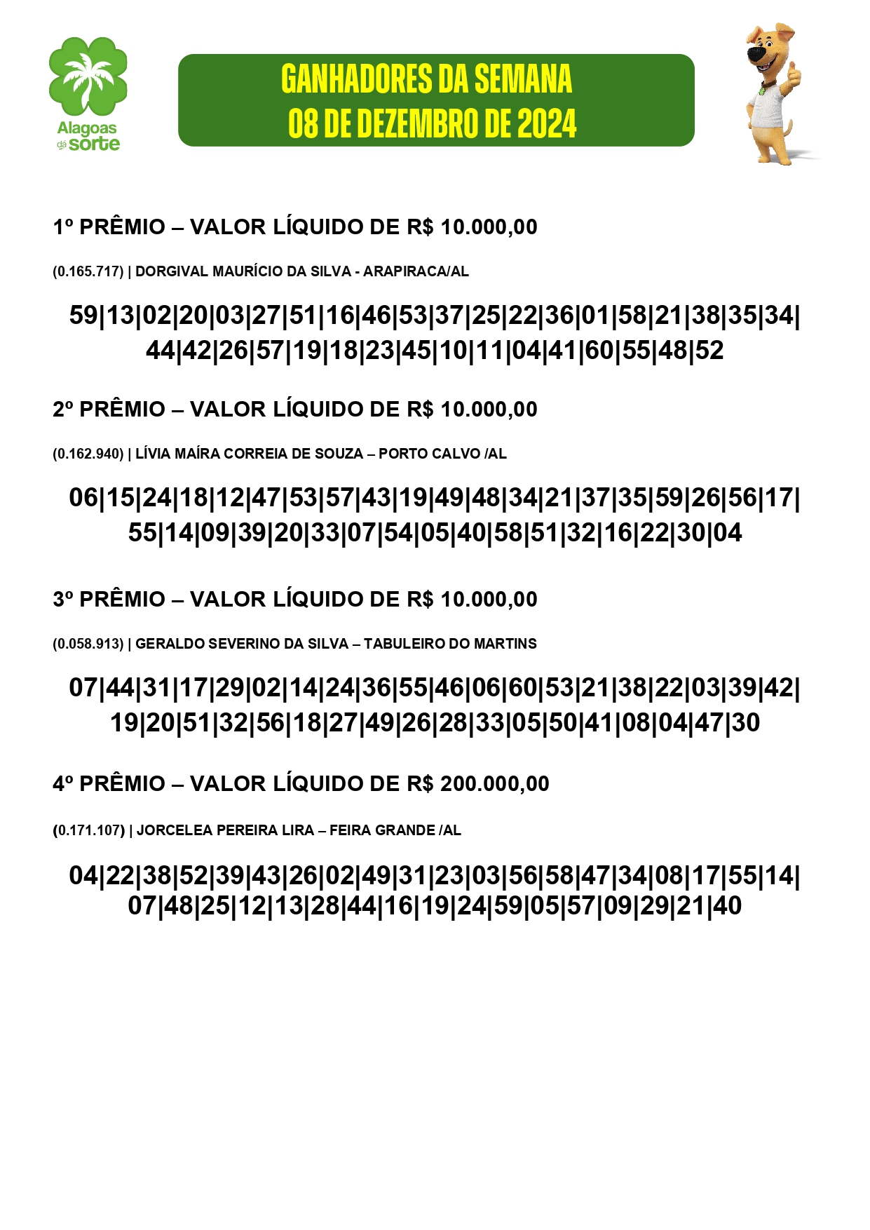 Confira os resultados do Alagoas dá Sorte deste domingo, dia 08 de dezembro de 2024.