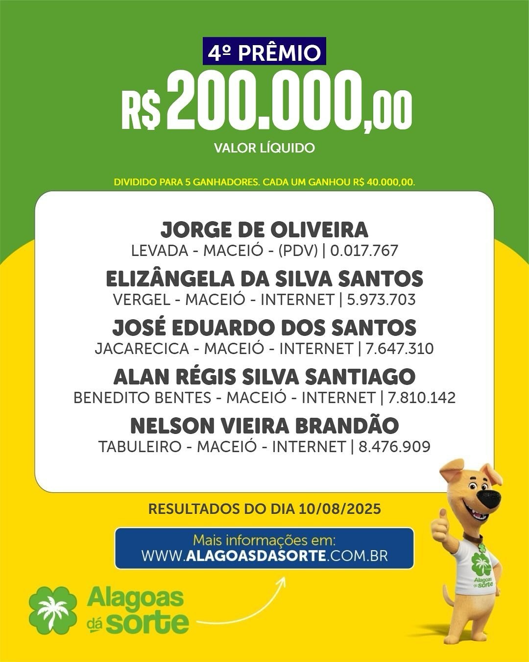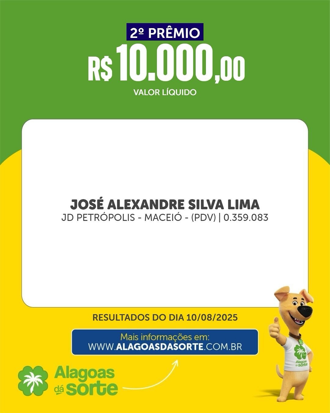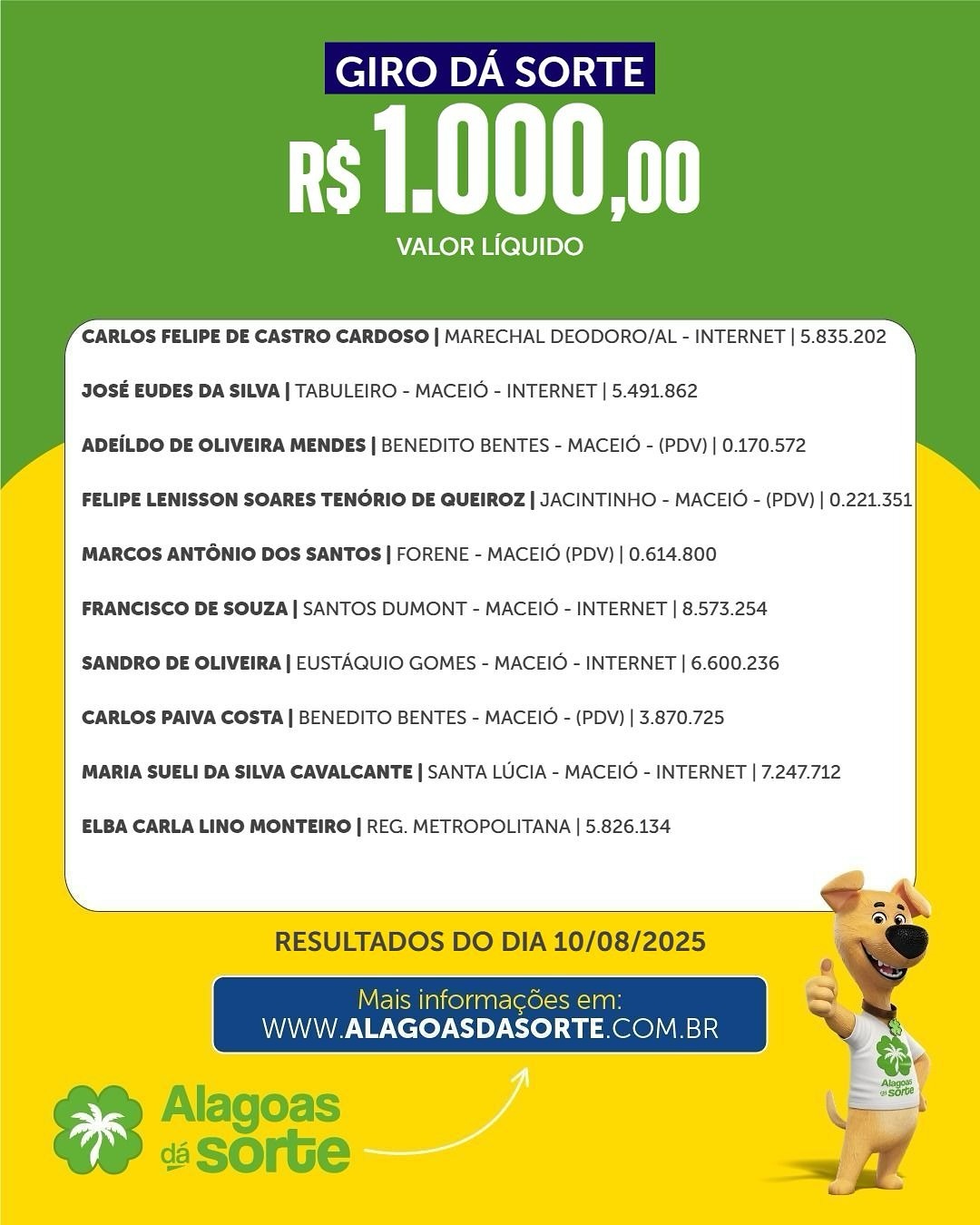 Confira os ganhadores do Alagoas dá Sorte deste domingo, dia 10 de agosto de 2025, dia dos Pais.
