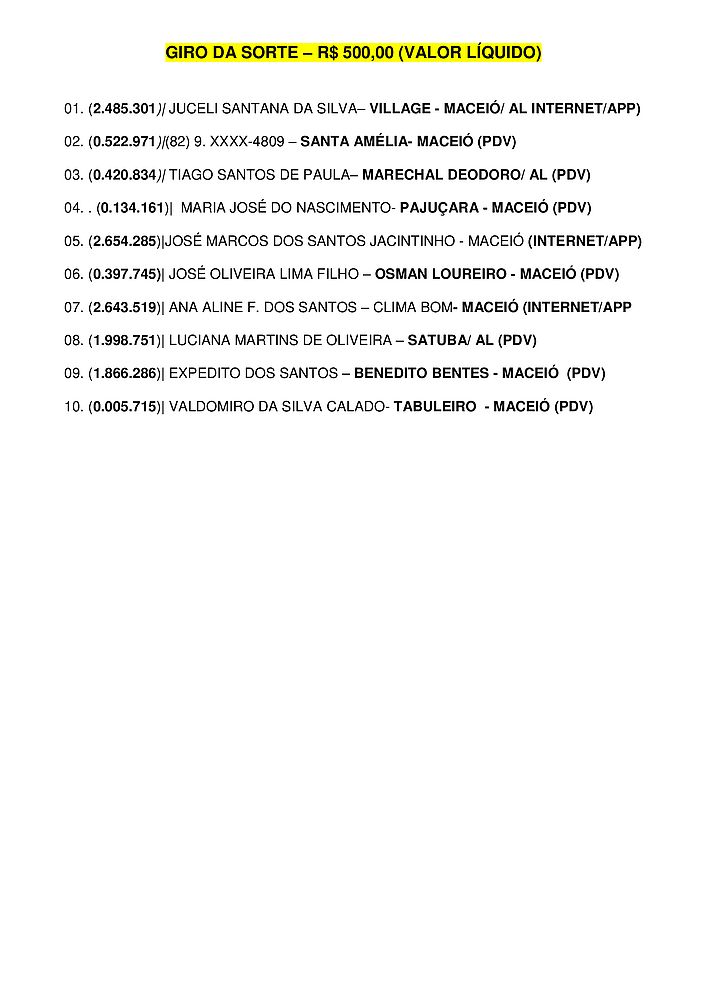 Confira os ganhadores do Alagoas dá Sorte deste domingo, dia 11 de fevereiro de 2024.