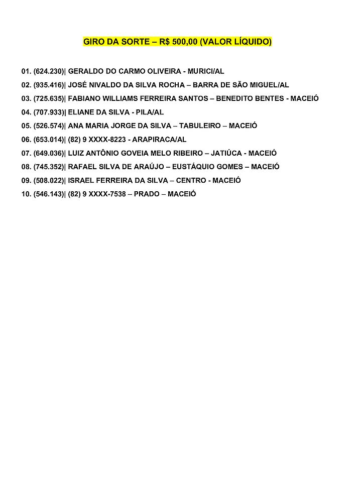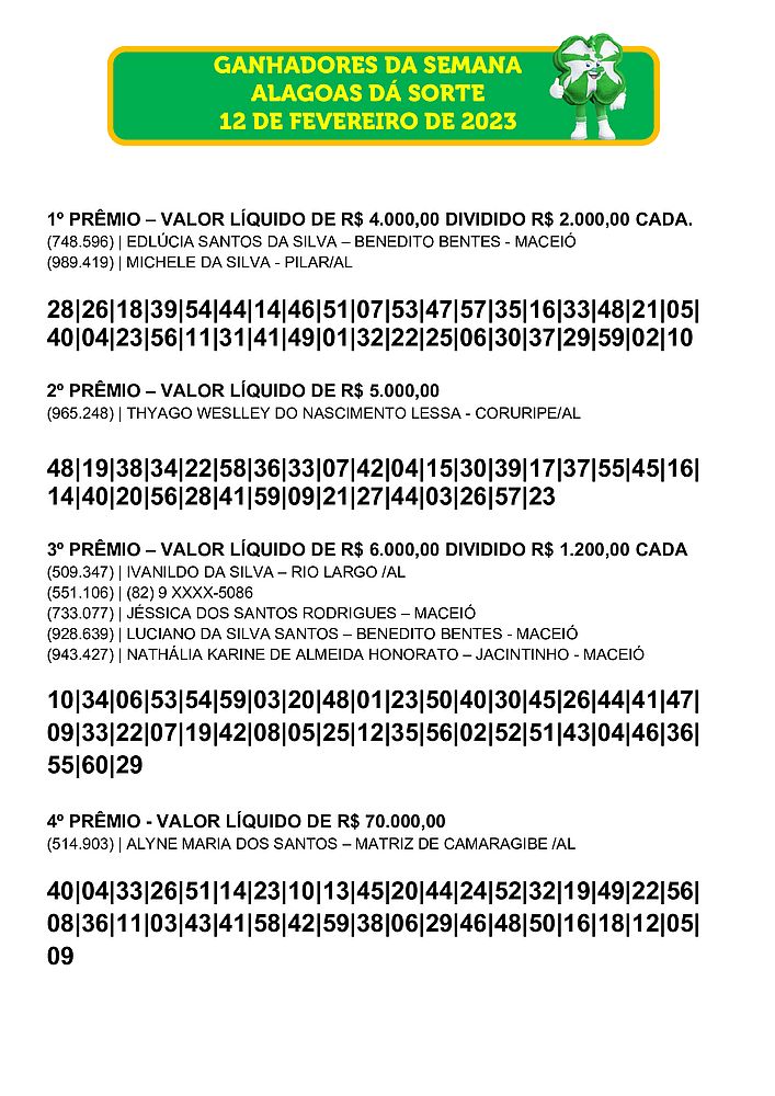 Confira os ganhadores do Alagoas dá Sorte deste domingo (12):