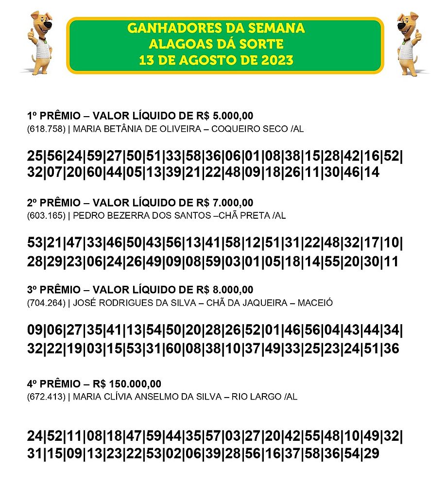 Confira os ganhadores do Alagoas dá Sorte deste domingo, dia 13 de agosto de 2023.