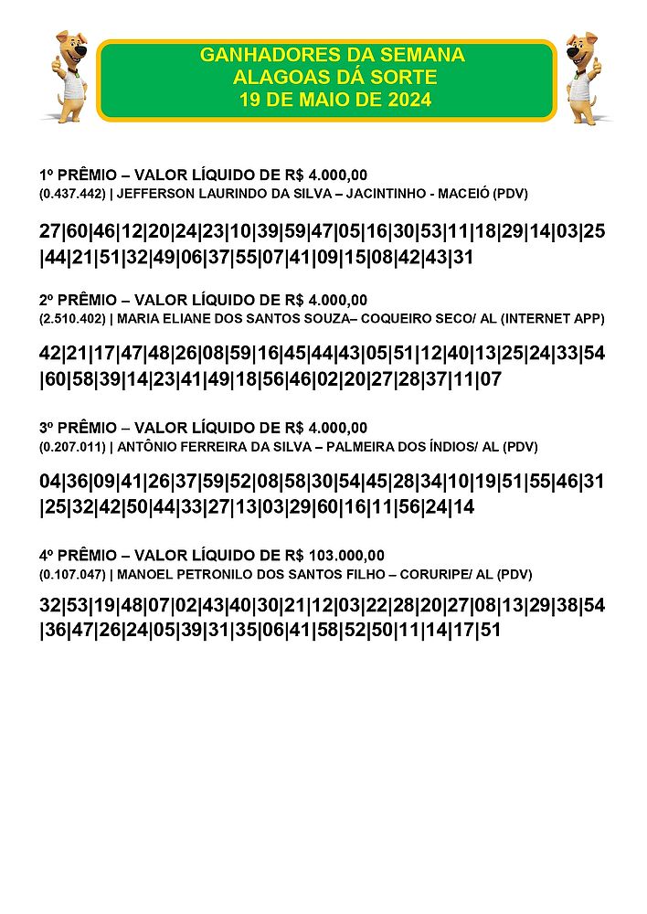 Confira os ganhadores do Alagoas dá Sorte deste domingo, dia 19 de maio de 2024.