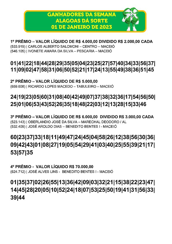 Confira os ganhadores do Alagoas dá Sorte deste domingo, dia primeiro de janeiro de 2023.