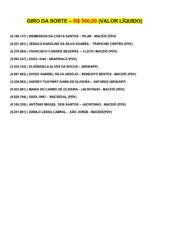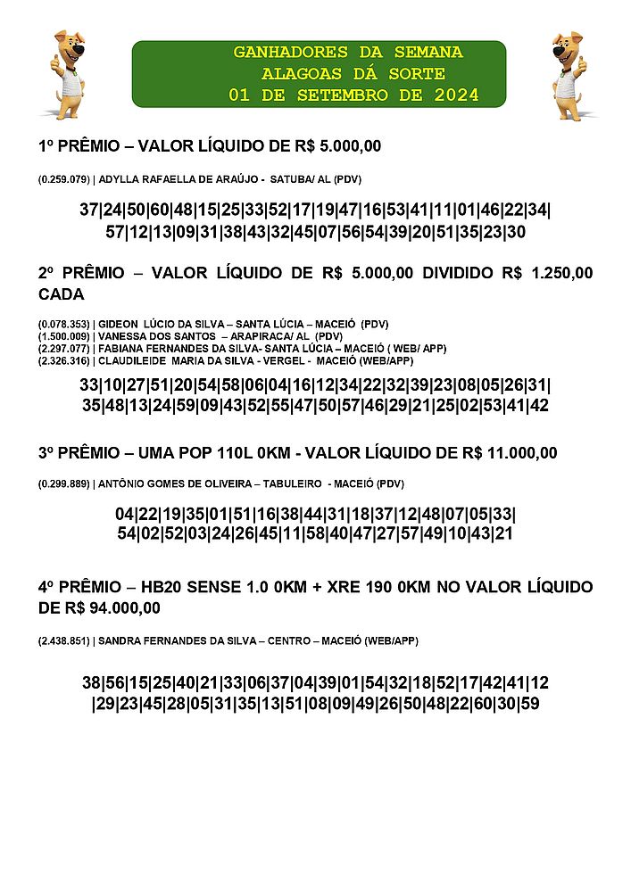 Confira os resultados do Alagoas dá Sorte deste domingo, dia 1º de setembro de 2024.