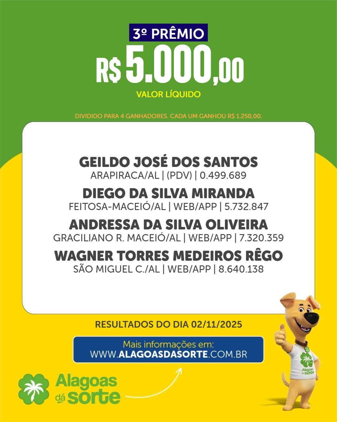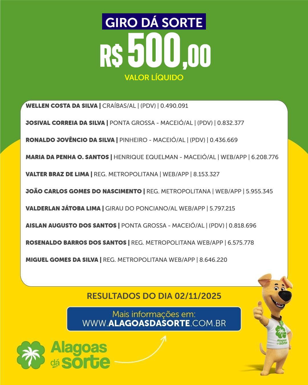 Confira os resultados do Alagoas dá Sorte deste domingo, 2 de novembro de 2025.