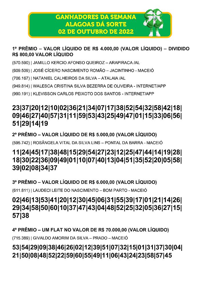 Confira os ganhadores do Alagoas dá Sorte, 2 de outubro de 2022.