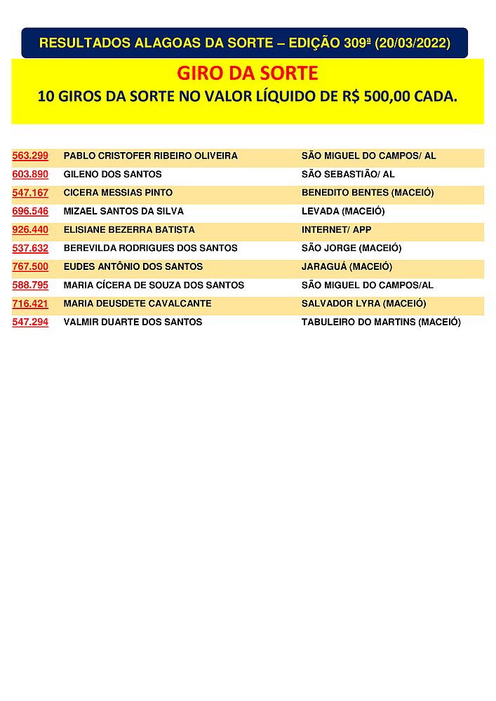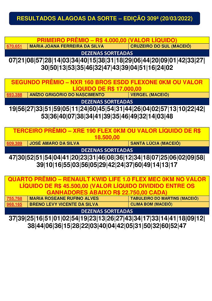 Confira os resultados do Alagoas dá Sorte deste domingo, dia 20 de março de 2022.
