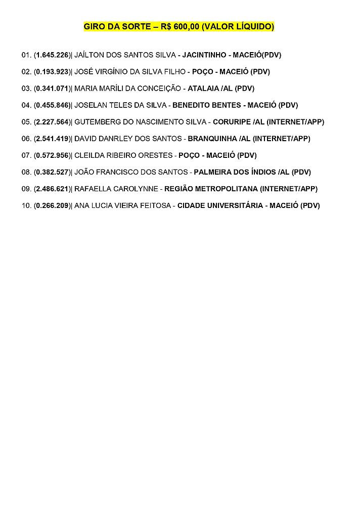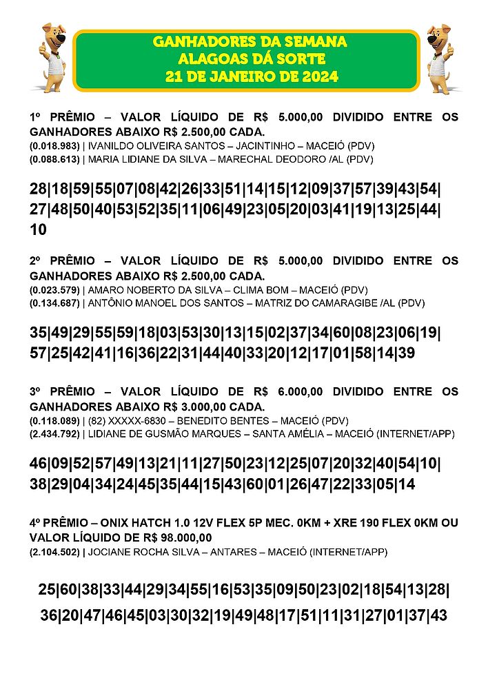 Confira os ganhadores do Alagoas dá Sorte deste domingo, dia 21 de janeiro de 2024.
