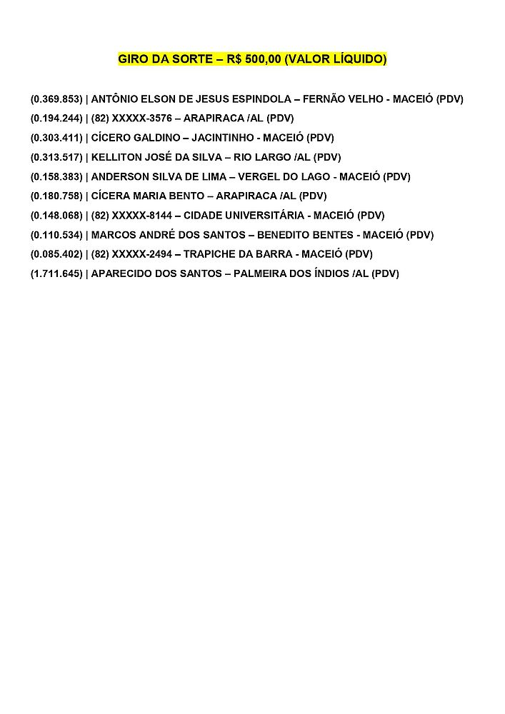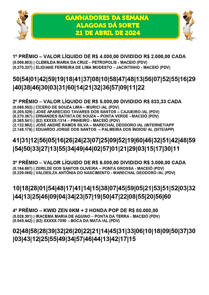 Confira os ganhadores do Alagoas dá Sorte deste domingo, dia 21 de abril de 2024.