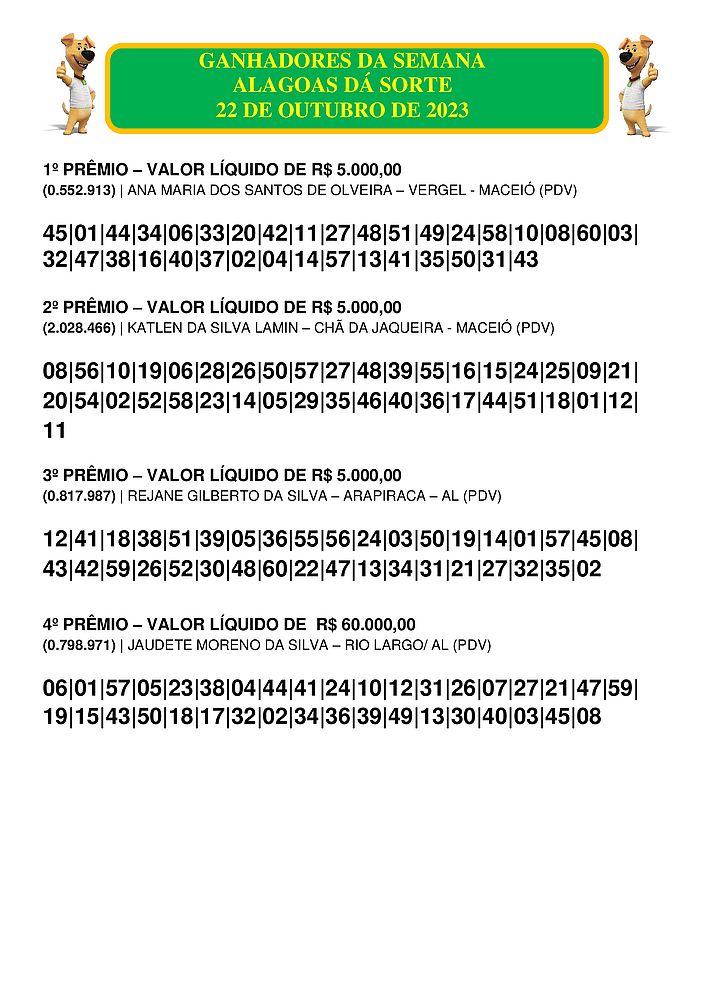 Confira os resultados e os ganhadores do Alagoas dá Sorte deste domingo, dia 22 de outubro de 2023.