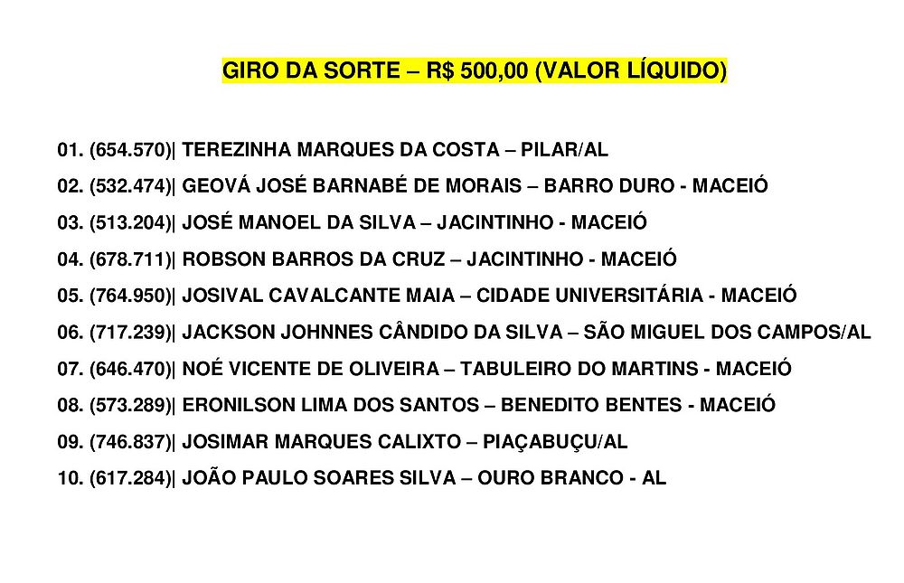 Veja os ganhadores do sorteio do Alagoas dá Sorte deste domingo, 23 de novembro