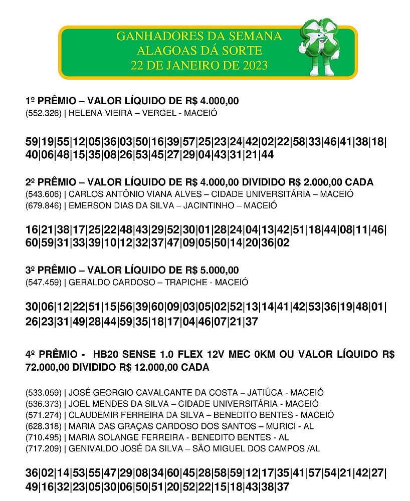Confira os ganhadores do Alagoas dá Sorte deste domingo, dia 22 de janeiro de 2023.