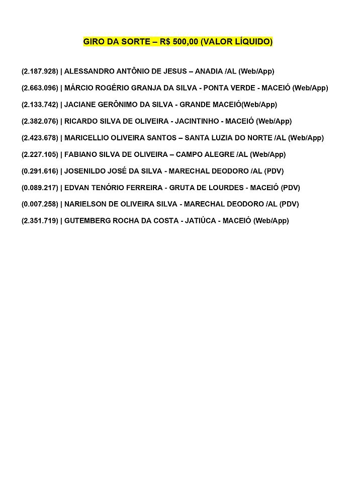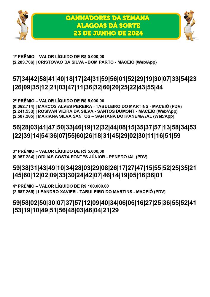Confira os ganhadores do Alagoas dá Sorte deste domingo, dia 23 de junho de 2024.
