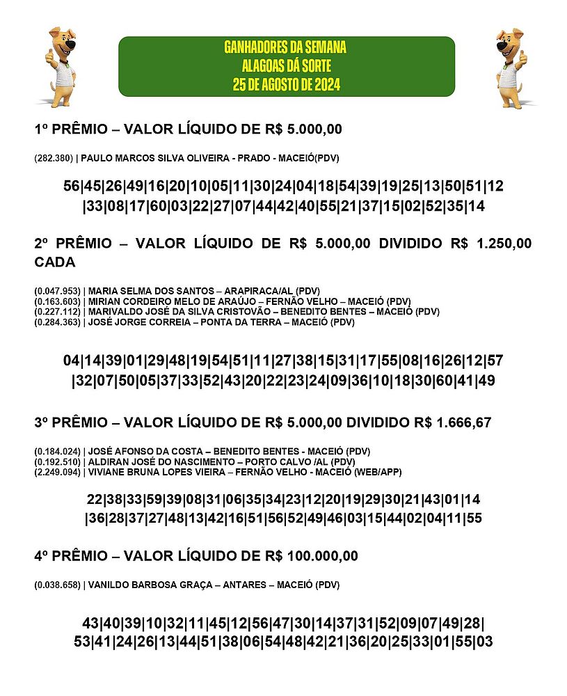 Confira os ganhadores do Alagoas dá Sorte deste domingo, dia 25 de Agosto de 2024.