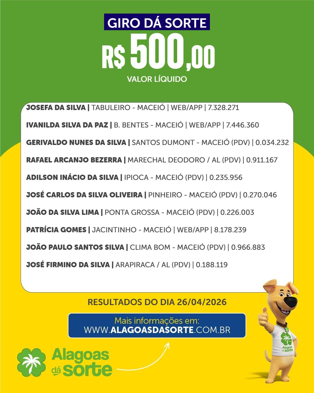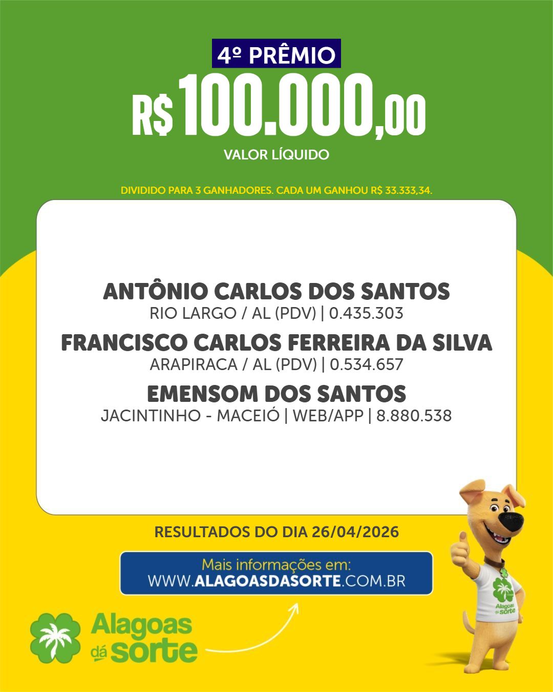 Confira os ganhadores do Alagoas dá Sorte deste domingo, dia 26 de abril de 2026.