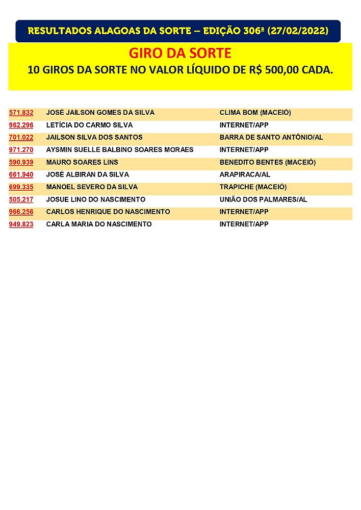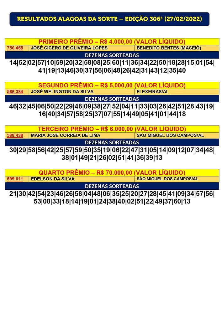 Confira os resultados do Alagoas Dá Sorte deste domingo, 27 de fevereiro de 2022.