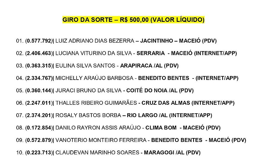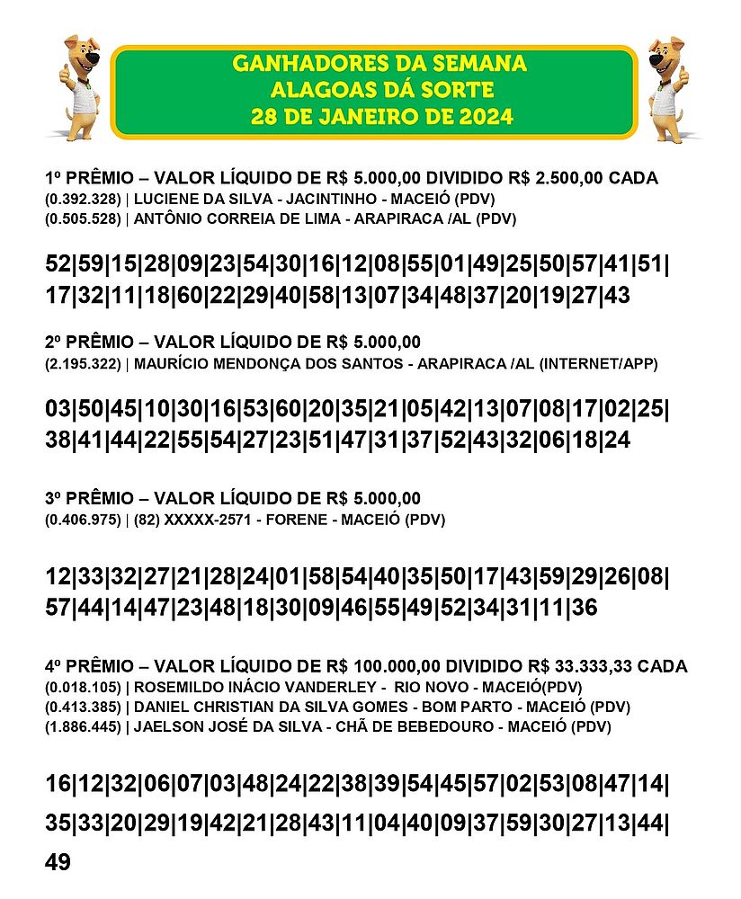 Confira os ganhadores do Alagoas dá Sorte deste domingo, dia 28 de janeiro de 2024.