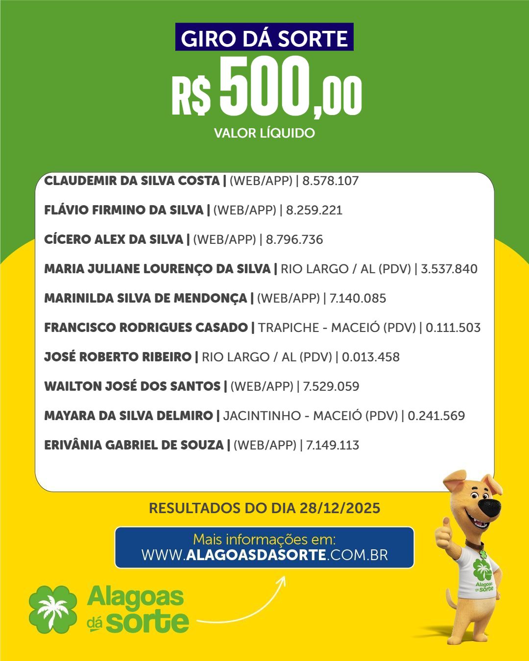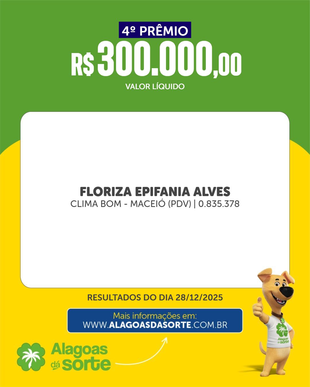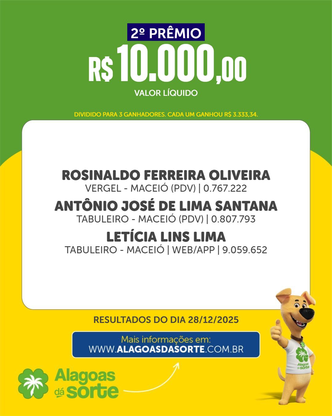 Confira os resultados do Alagoas dá Sorte deste domingo, 28 de dezembro de 2025.