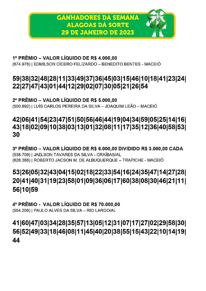 Confira abaixo os premiados no Alagoas dá Sorte deste domingo, dia 29 de janeiro de 2023.