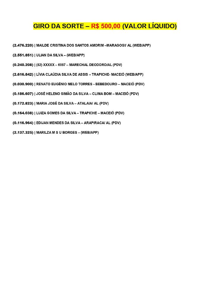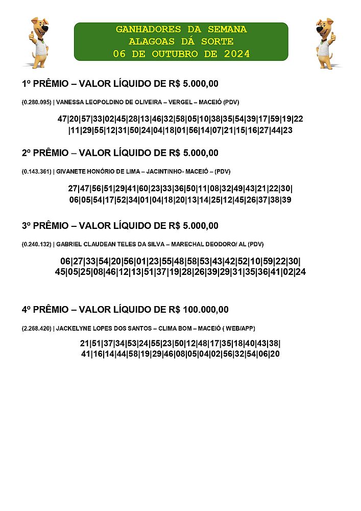 Confira os ganhadores do Alagoas dá Sorte deste domingo, dia 6 de outubro de 2024.