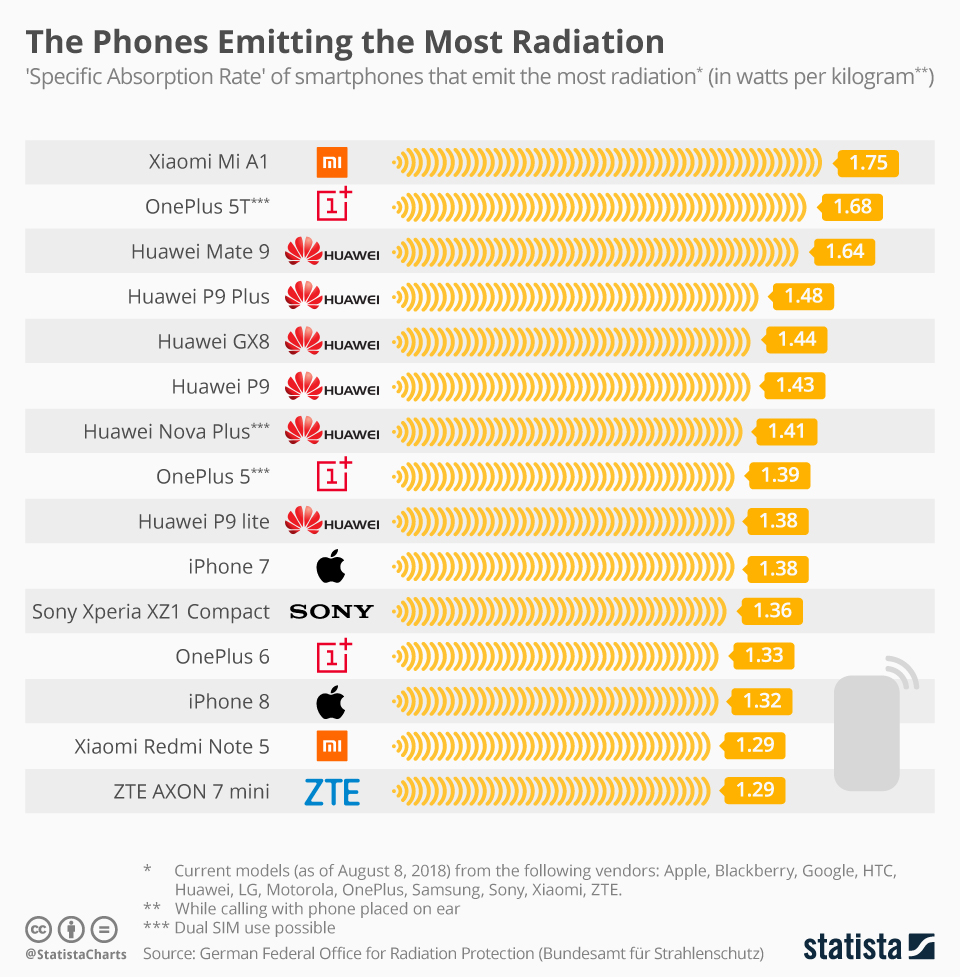 A lista foi feita com base no Escritório Federão Alemão de Proteção contra Radiação (Bundesamt für Strahlenschutz), que mantém um banco de dados atualizado com a quantidade de radiação emitida por diversos celulares, dos mais antigos aos mais modernos. Em primeiro lugar vem o MI A1, da Xiaomi, 1,75 watts por quilograma emitido. A Huawei é a que mais aparece na lista, com seis de 15 aparelhos analisados.