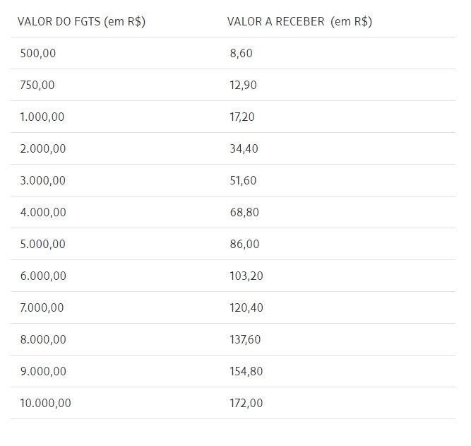 O trabalhador que tinha saldo positivo em conta do FGTS em 31 de dezembro de 2017 terá direito a receber 1,72% do valor que tinha na época. Isso significa que o trabalhador receberá R$ 17,20 para cada R$ 1.000. Em média, os trabalhadores receberão R$ 38 por conta.