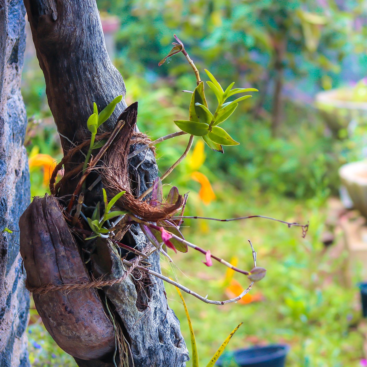 Plantas como suporte: um outro substrato super legal e interessante é amarrar a sua orquídea em outra planta, de preferência uma árvore, para que elas utilizem como suporte e se desenvolvam como ocorrem nas florestas tropicais.