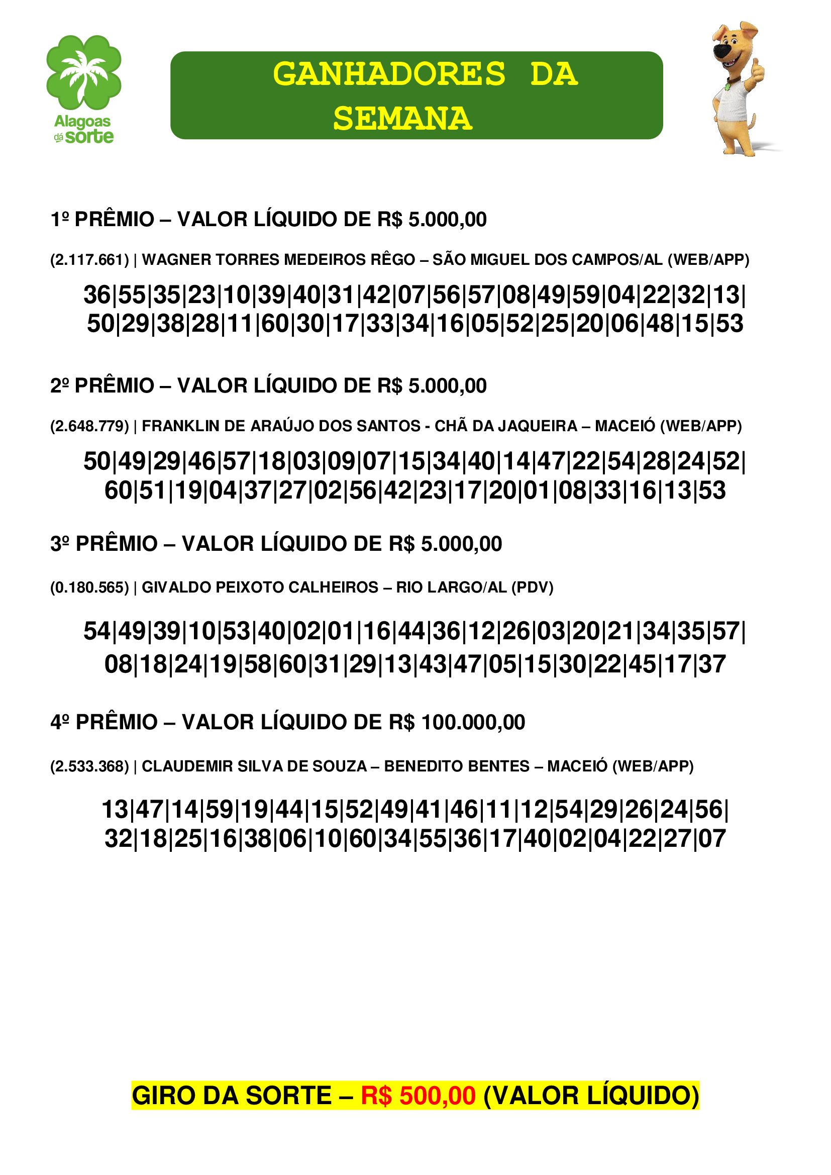 Conheça os ganhadores do Alagoas Dá Sorte deste domingo, 30 de novembro