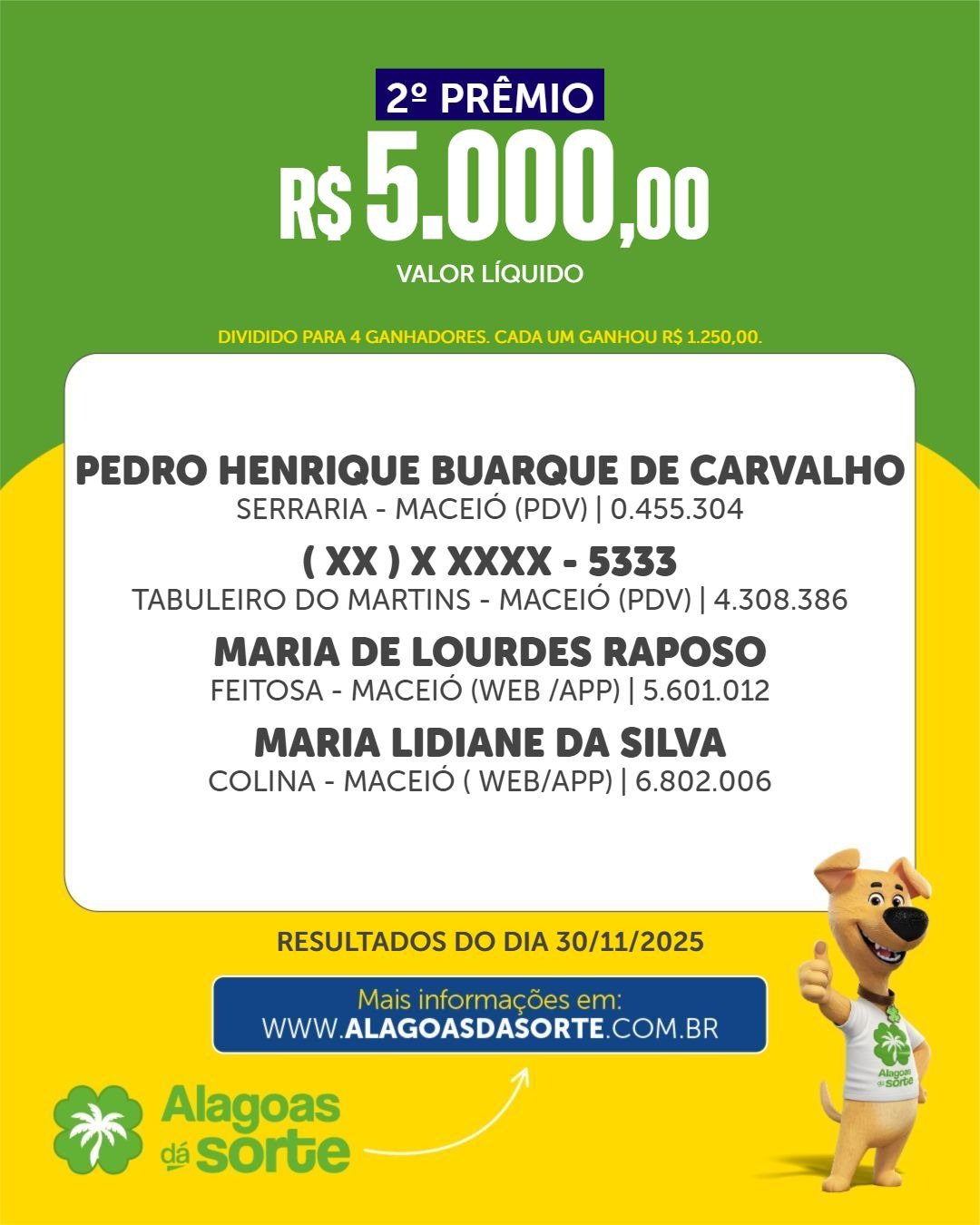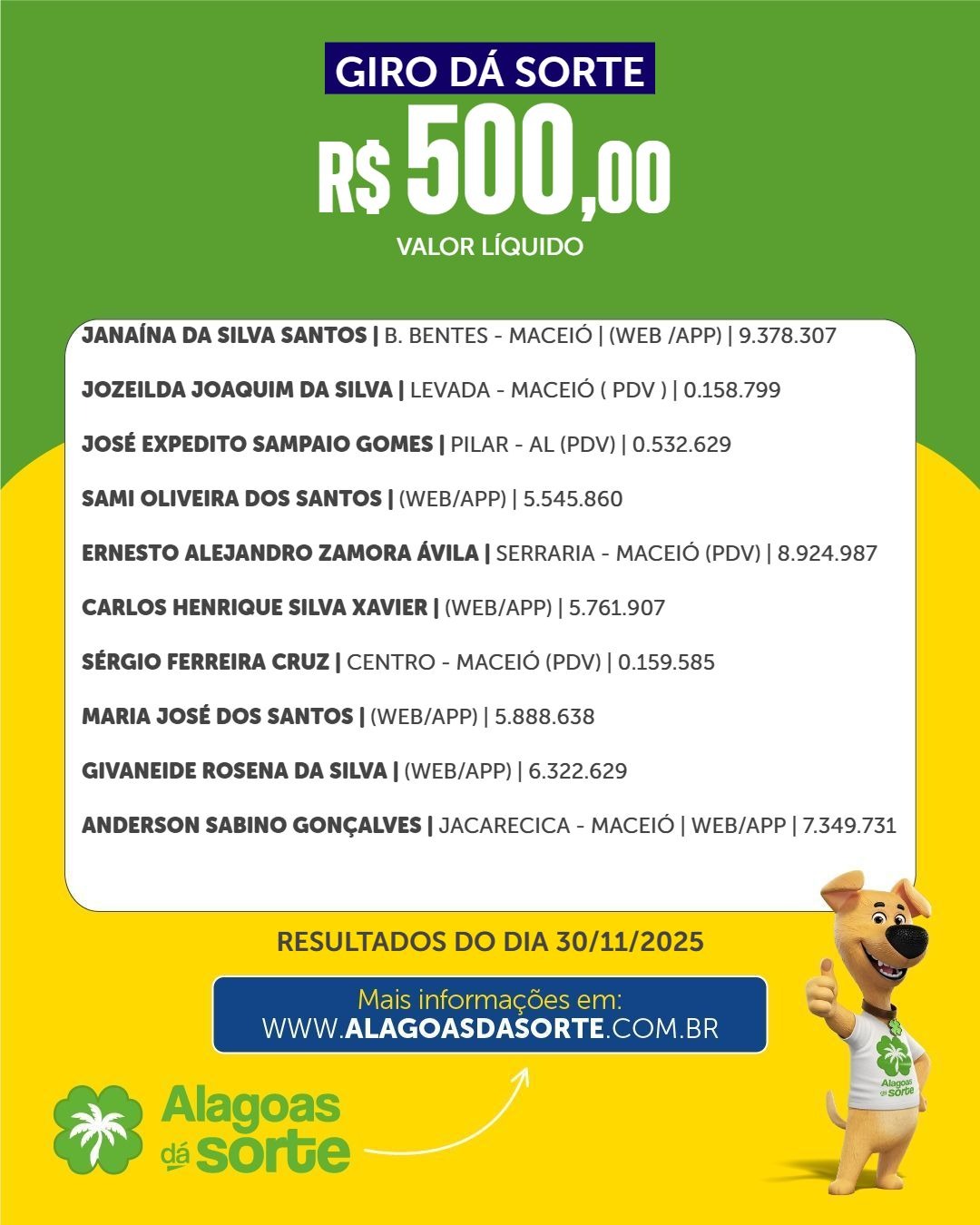 Veja os ganhadores do sorteio do Alagoas dá Sorte deste domingo, 23 de novembro