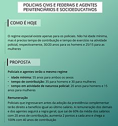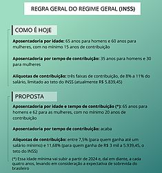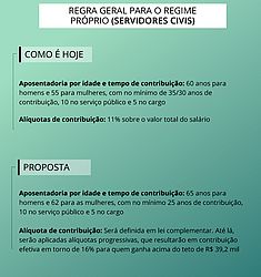 A Proposta de Emenda à Constituição 6/19 pretende alterar o sistema de Previdência Social para os trabalhadores do setor privado e para os servidores públicos de todos os Poderes e de todos os entes federados (União, estados e municípios). A idade mínima para se aposentar será de 65 anos para os homens e 62 para as mulheres. Há regras de transição para os atuais contribuintes.