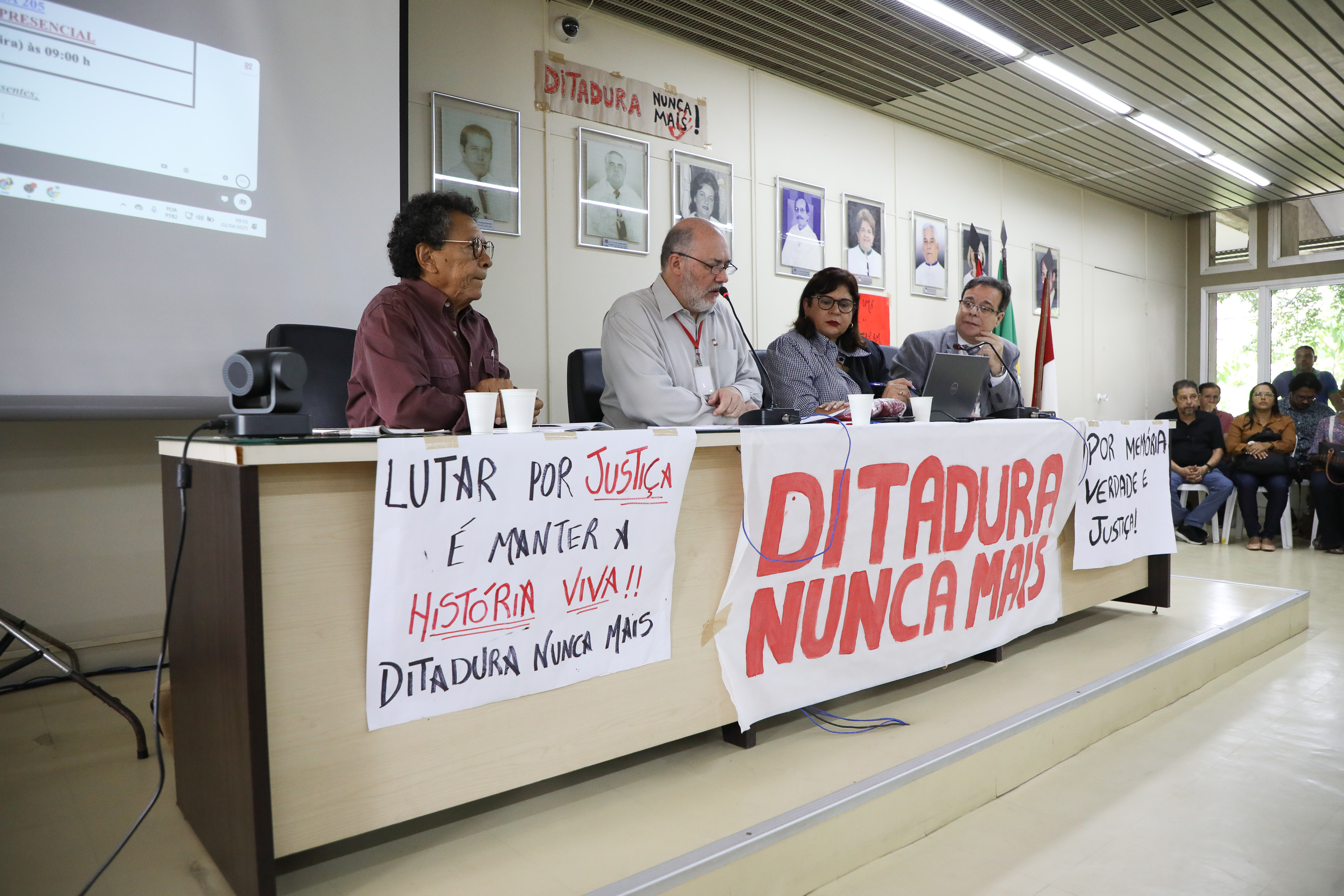 O reitor Josealdo Tonholo abriu os trabalhos do dia 1º de abril, na data em que se completou 61 anos do Golpe Militar, e convidou para a mesa o sociólogo Edval Cajá, que veio de Recife especialmente para participar deste evento, e também o presidente e o vice-presidente da Comissão da Verdade Jayme Miranda, Delson Lyra e Everaldo Patriota, respectivamente.