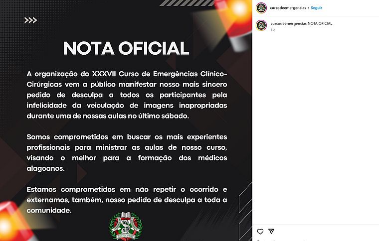 "A organização do XXXVII Curso de Emergências Clínico-Cirúrgicas vem a público manifestar nosso mais sincero pedido de desculpas a todos os participantes pela infelicidade da veiculação de imagens inapropriadas durante uma de nossas aulas no último sábado.