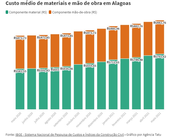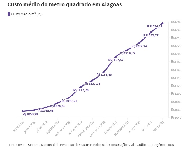 Para a construção de um metro quadrado de um imóvel, o alagoano precisa desembolsar em média R$1.276,38. Há um ano, esse valor estava R$220,10 mais barato, o que representou um aumento de 21% no custo médio das construções. É o que informa o Índice Nacional da Construção Civil (SINAPI), analisado pela Agência Tatu. O período abrange os meses de maio de 2020 a maio de 2021.