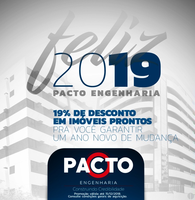 Fim de ano chegando e mudança é o principal desejo de todos que acreditam em um 2019 melhor. E a PACTO ENGENHARIA traz uma oportunidade inédita para quem desejar mudar de vida e de endereço. É a campanha FELIZ 2019, onde a construtora oferece por tempo limitado 19% de desconto em todos os seus imóveis prontos. A chance de entrar o ano novo já de casa nova vale apenas para contratos fechados até 15/12/2018.