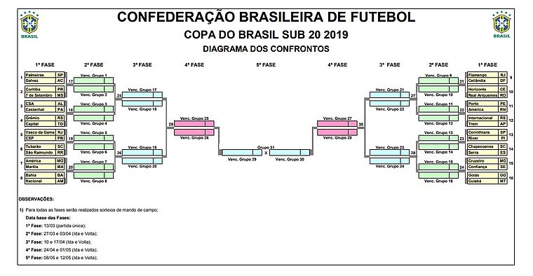 Os confrontos da Copa do Brasil Sub-20 de 2019 já estão definidos. A Diretoria de Competições da CBF divulgou nesta segunda-feira (18) os documentos técnicos do torneio: Plano Geral de Ação, Regulamento Específico e o Diagrama dos Confrontos. O sorteio do mando de campo será na próxima quinta-feira. A competição tem previsão de início para o dia 13 de março, com bola rolando para os confrontos da primeira fase. Representantes de Alagoas na competição, o CSA vai enfrentar o Castanhal-PA. Nesta etapa, as partidas serão disputadas em jogo único. Ao todo, 32 times participam do torneio.